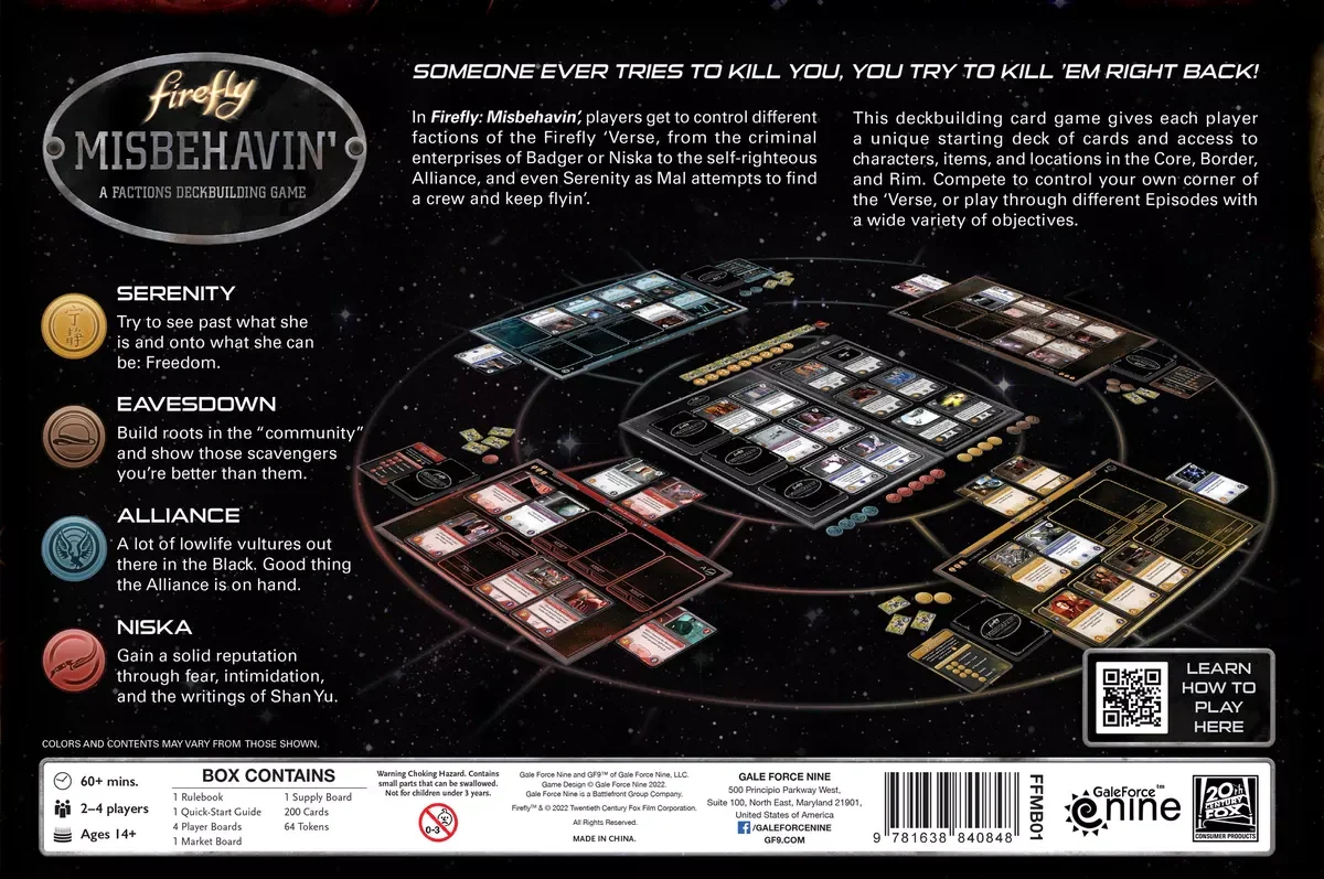 In Firefly: Misbehavin', players get to control different factions of the Firefly 'Verse, from the criminal enterprises of Badger or Niska, to the self-righteous Alliance, and even Serenity as Mal attempts to find a crew and keep flyin'.