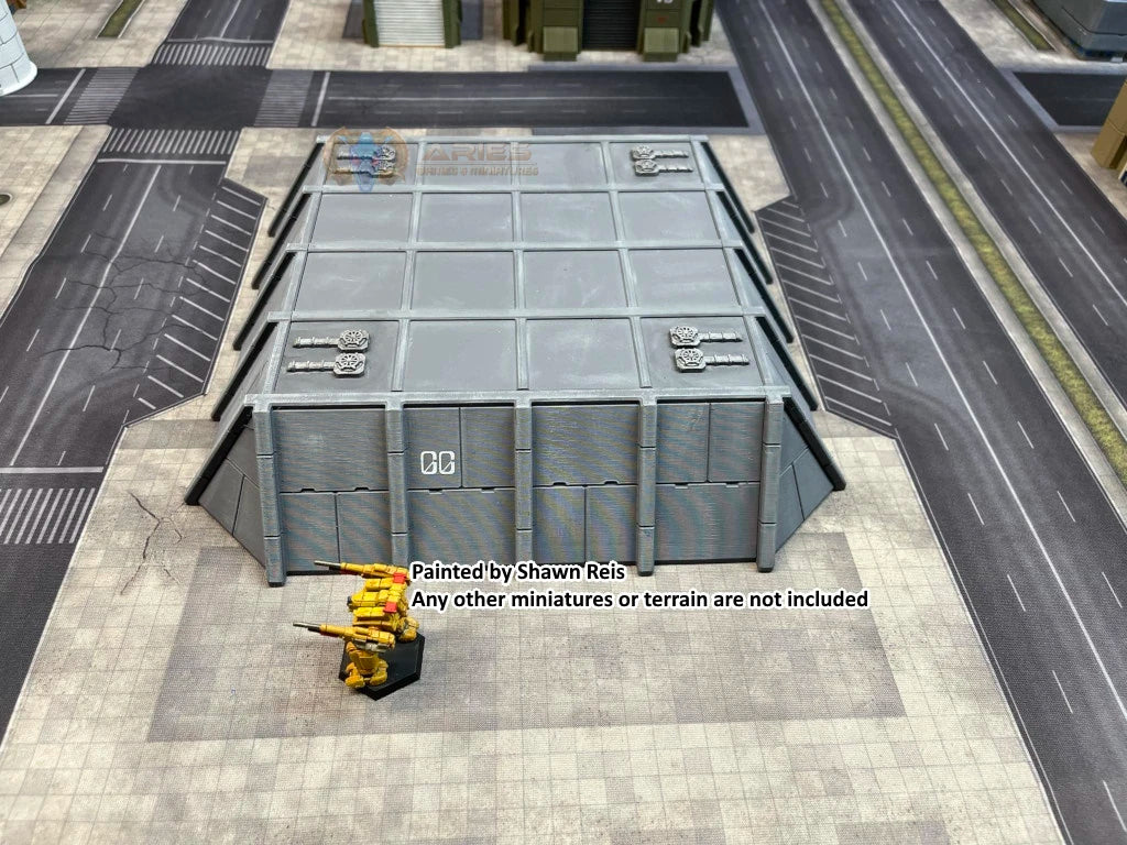 A large, reinforced hangar (or aquatic sub/boat pen) designed to hold vehicles, aircraft, watercraft, cargo, and even most 'mecha. With a flat, play-on roof and an 8" square by 2.25" tall interior, this is a great addition to any runway, warehouse, or port.