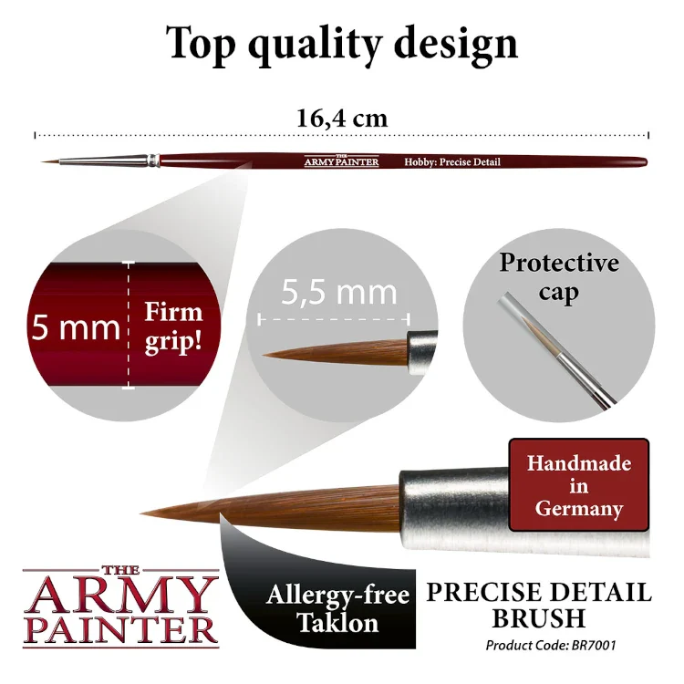 This brush will allow you to perform any precision paintjob you want on your miniatures. It has a very sharp point, is small and thin enough to get anywhere on a model.