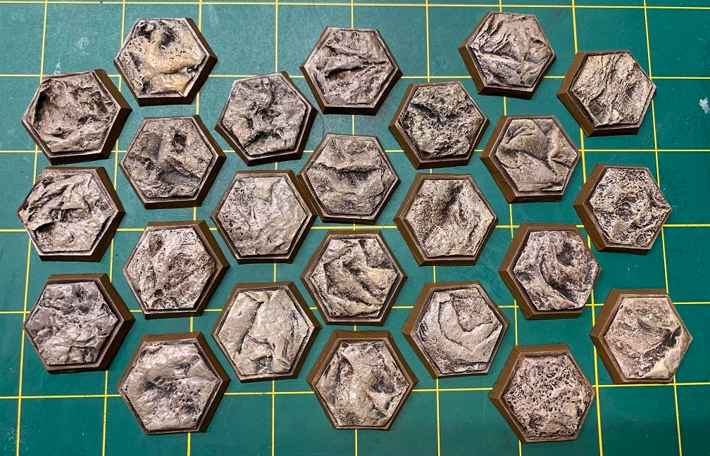 4-Pack T-Hex Terrain presents a series of sculpted miniature hex bases. Take your forces to biomes found in all manner of wargames and present your models quickly and easily on detailed terrain.