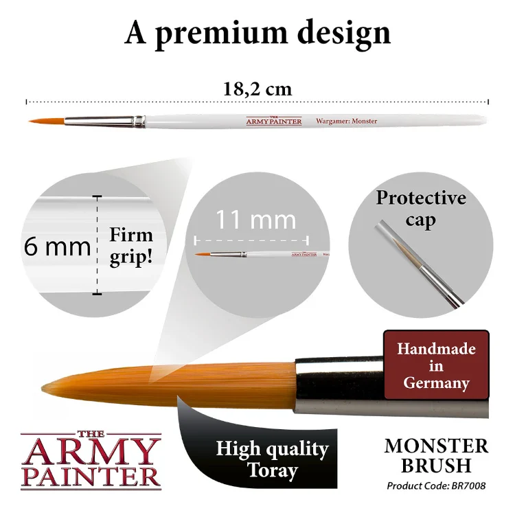 The Monster Brush has the right size for any larger models such as Dragons, Trolls, Warmachines and Vehicles. This brush is made from the finest Toray synthetic due to the fact that a sable brush of this size could potentially "drown" a miniature in paint - whereas the Toray releases the paint slower.